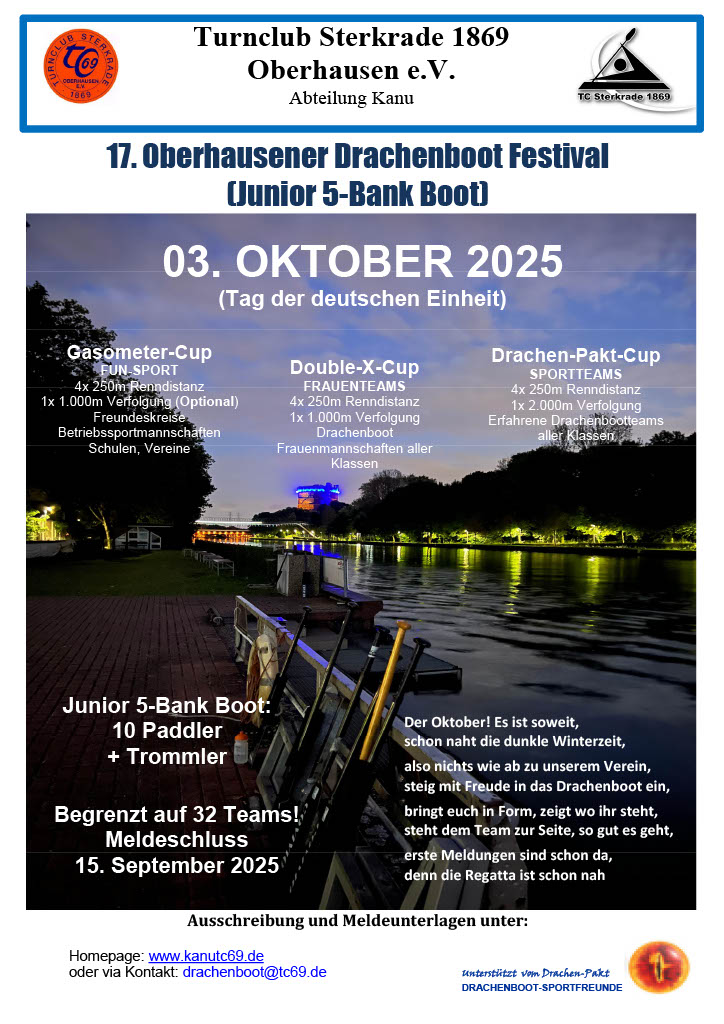 Der Turnclub Sterkrade 1869 Oberhausen e.V. – Abteilung Kanu – lädt ein zum großen Drachenboot-Event!